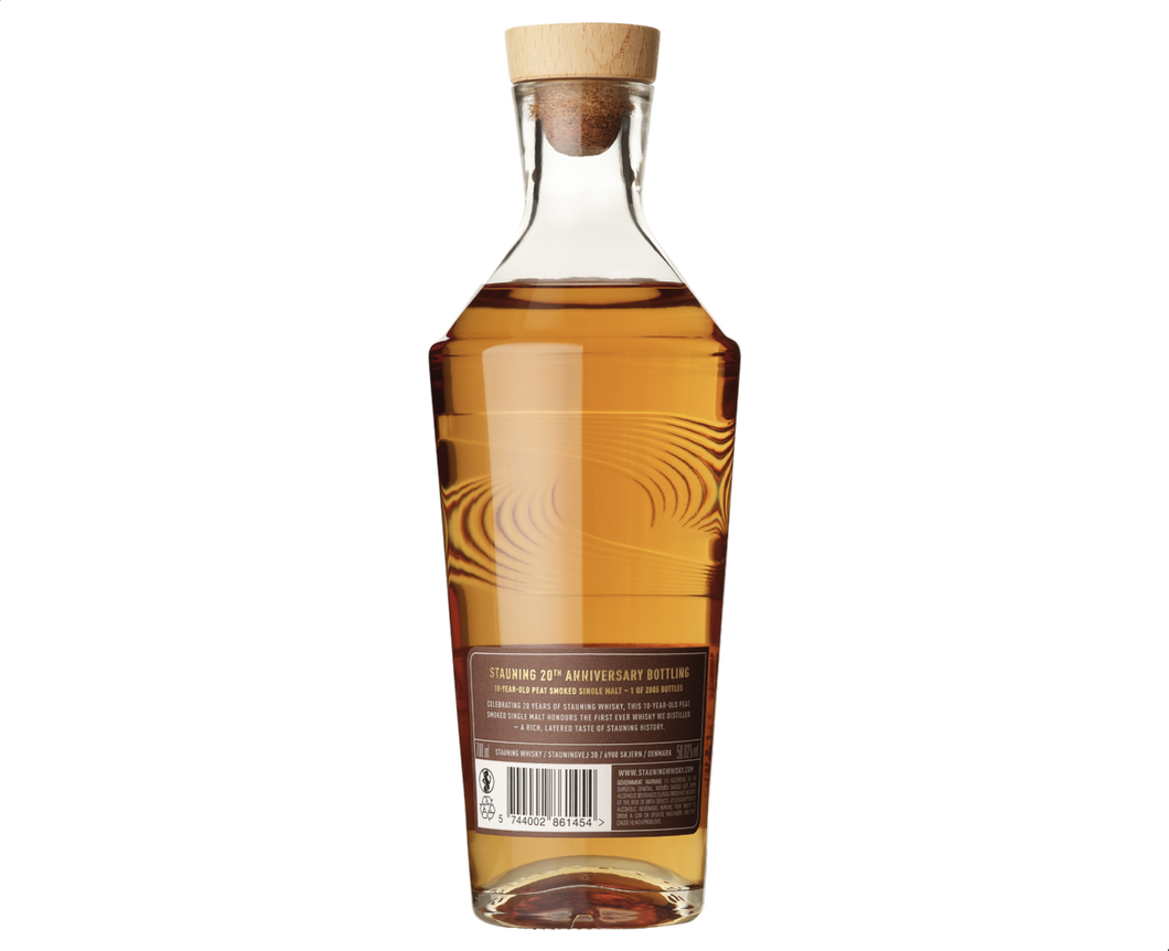 Stauning 20th Anniversary Edition består af lige dele røget og urøget single malt whisky, lagret i minimum 10 år på et udvalg af fade: 8 ex-Bourbon, 3 virgin oak, 2 ex-port og 1 ex-sherry. Resultatet er en kompleks, balanceret og dybt karakterfuld whisky med tydelig reference til vores oprindelse.